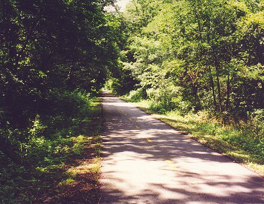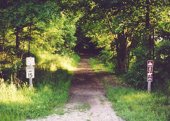 I rode back to Bull Valley Road and went west to the Prairie Trail north into McHenry. It was pretty in the early morning light. I saw a few friendly runners putting in their miles before the heat of day struck. The trail was closed for construction north of McCullom Lake Road, unfortunately for me (fortunately for the locals who are by now enjoying the newly paved path). I carried a thick stack of 80 maps printed from Microsoft Streets 98 with me for this very reason, so I was able to successfully find my way back to the trail further north in Ringwood. While it had been paved in McHenry, here the Prairie Trail was described by guidebooks as " natural" or " ballast." It was kind of a cross between dirt and gravel. In some places it was especially rough from horse traffic. In general, the trail was okay for my hybrid, but I wouldn't take a skinny-tired road bike on it. At least it was easy to follow, and the isolation was a nice change from the heavily traveled route I had ridden on Friday.