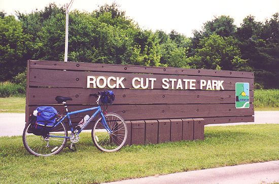 Things went figuratively downhill from there. First I had to figure out a route to Rock Cut. Ominously, a closed bridge obstructed my path down Main Street. I found my way around that, made a few turns and ended up on Illinois 173. I wasn't thrilled to be on a busy road, but most of it had an adequate shoulder. At 2:30 PM I reached Rock Cut and mimicked Friday night's photo at Moraine Hills, hoisting the bike over a high curb and leaning it against the entrance sign.
