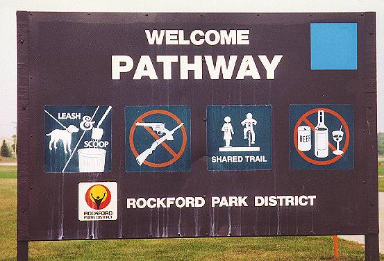 I crossed back over to the west side of the Rock River, where I came to a sign for the “Pathway.” This sign was interesting because in addition to reminding cyclists and walkers to share the trail and dog walkers to clean up after their pets, the sign also depicted firearms and alcohol with red circles and lines drawn through them. I might have expected “no hunting” signs on a more rural path, but this was a little unnerving. Was this a common problem here?