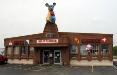 We got off to a decent start, driving out to my parents' house, picking up the rental car*, and dropping off our dog by 11 AM. With 500 miles to cover, we quickly transferred our things from our car to the rental and hit the road. We got hungry around Madison, Wisconsin, but none of the roadside restaurants struck our fancy. We stopped in Windsor at Mousehouse Cheesehaus. Much like the more famous cheese places along I-94 south of Milwaukee (i.e., Mars Cheese Castle), Mousehouse offered everything from souvenirs to liquor to gourmet condiments along with a sandwich counter. My ham and provolone sandwich was great, and I felt good about not stuffing myself.
