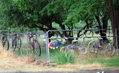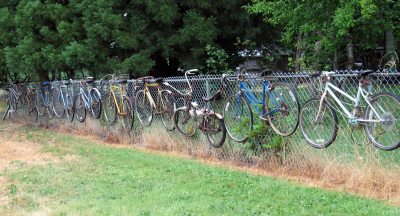Kristie showed us her apartment and then took us on a tour of the town, featuring the exciting bicycle fence, the Oregon State University campus, both of Corvallis' FedEx drop-off spots, Hewlett-Packard's printer cartridge plant, several grocery stores, and a lot of mundane scenery. I deemed the bicycle fence worth photographing.