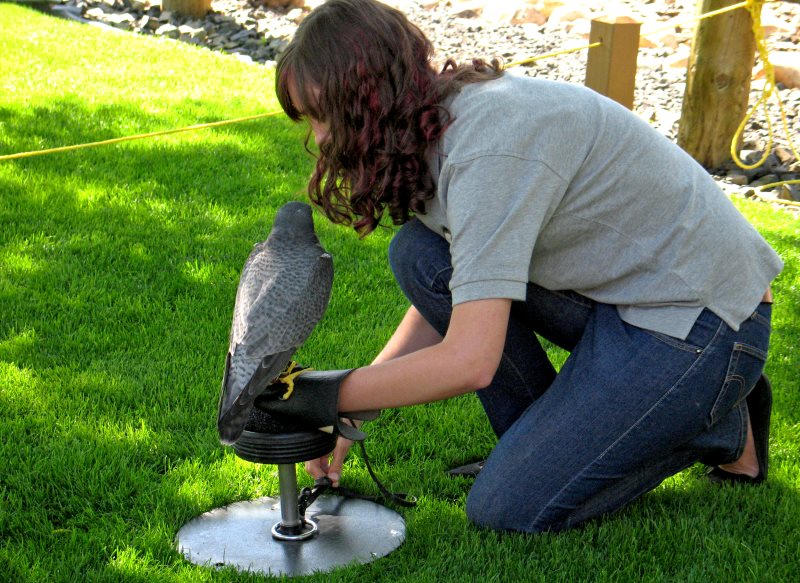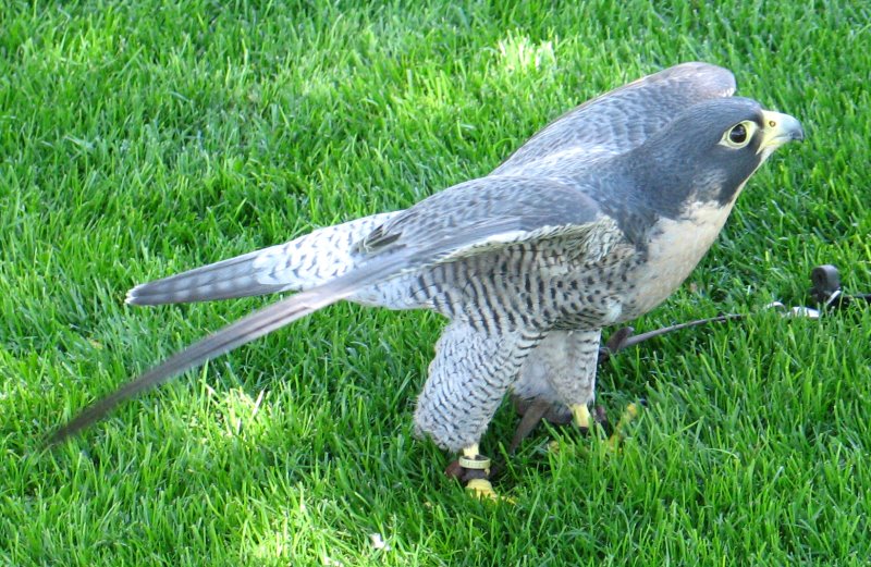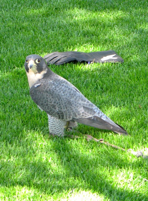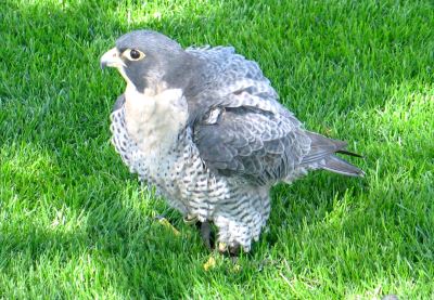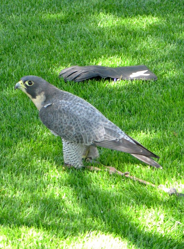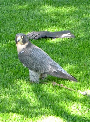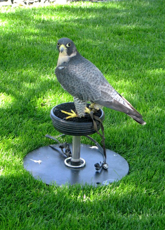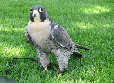 Another staff member brought out a peregrine falcon. Although the center no longer breeds them, this bird was a special case. When they tried to feed this bird, he had trouble grabbing food from them. They determined that he had such poor vision that he couldn't survive in the wild, so they kept him as a teaching bird.
