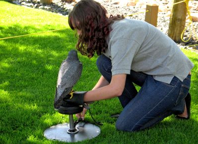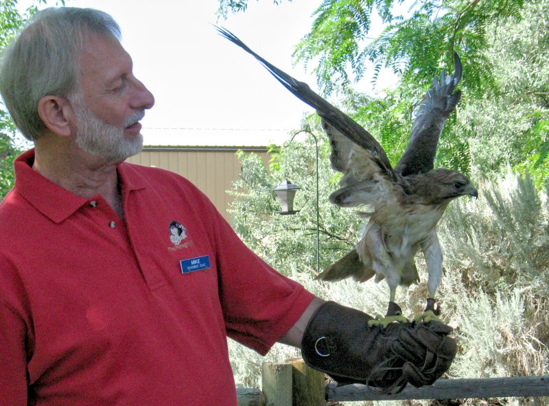 We walked out of the gift shop and looked at a few birds being held in large enclosures protected from mosquitoes by dense netting. We learned later that the center lost a number of birds to West Nile Virus last year. There were all sorts of smaller birds hanging around on the grounds as well. Though they weren't birds of prey, they recognized a hospitable environment amid the Idaho desert. Then we walked along the sidewalk past a lush, green lawn to the museum building. Most of the exhibits were self-explanatory, but Mike gave us a guided tour. We learned that the center has been so successful in reintroducing peregrine falcons that they have turned to other species instead. The center now breeds aplomado falcons and California condors to release into the wild. We got to see several more birds of prey behind mirrored glass in the exhibit building.