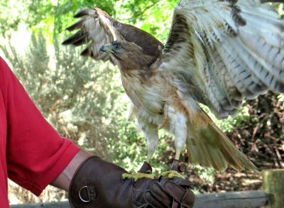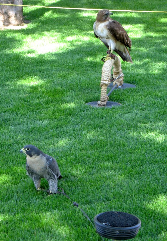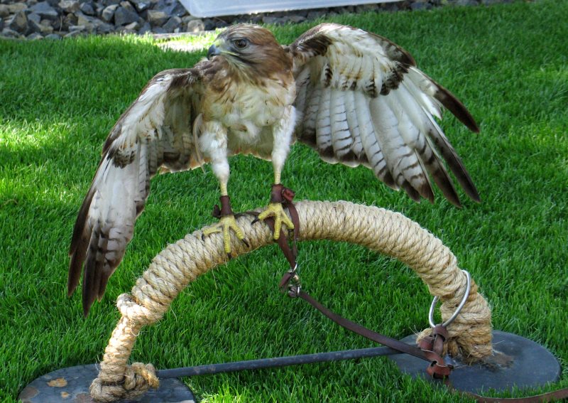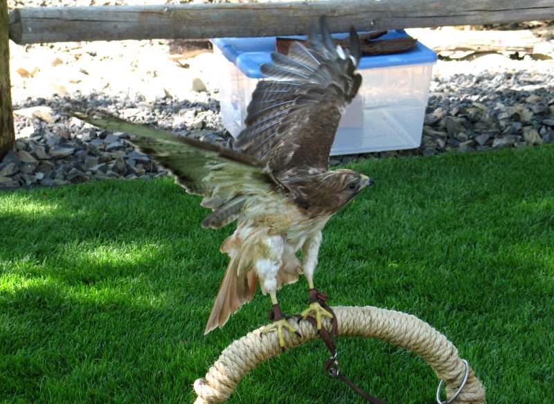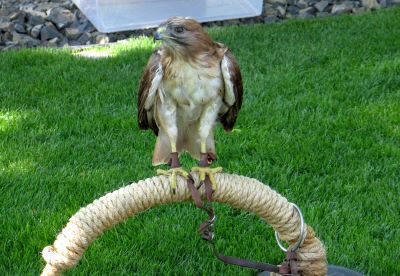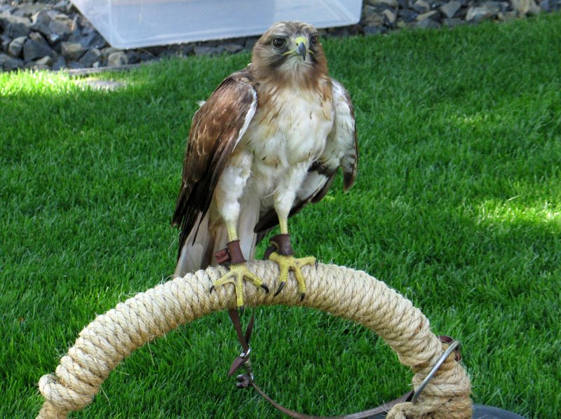 Then Mike brought a red-tailed hawk out to the lawn for us. The hawk was tethered, and an area was roped off to keep us from getting within its range. I took pictures of the hawk in various poses while Mike taught us all about this awesome bird.