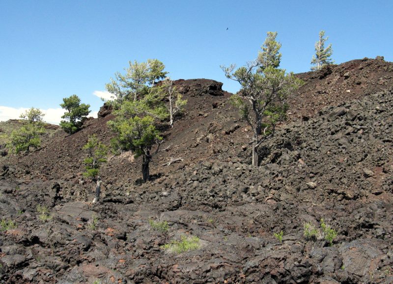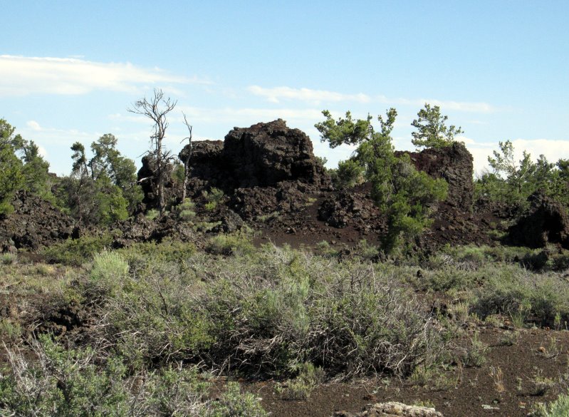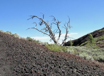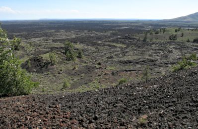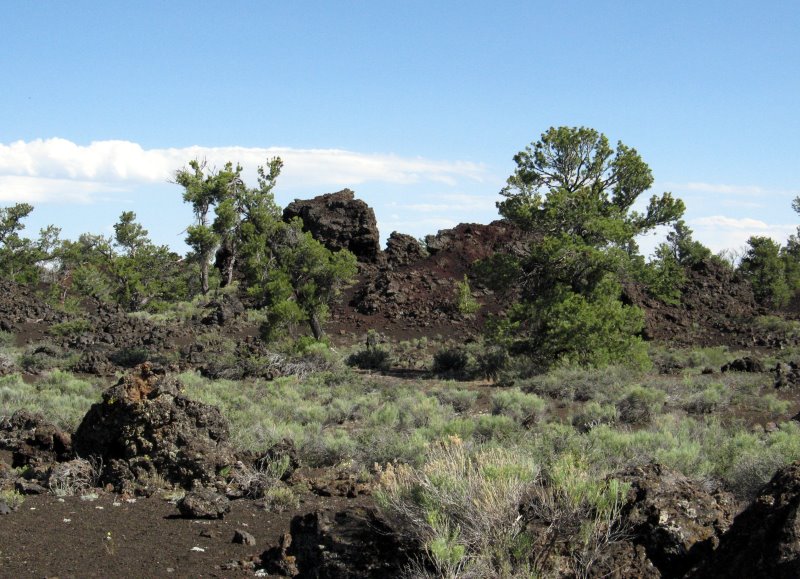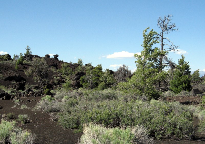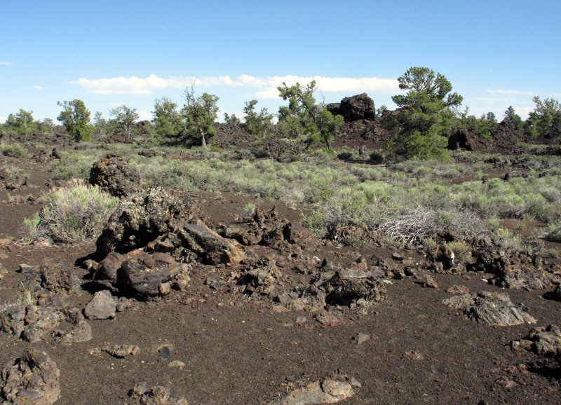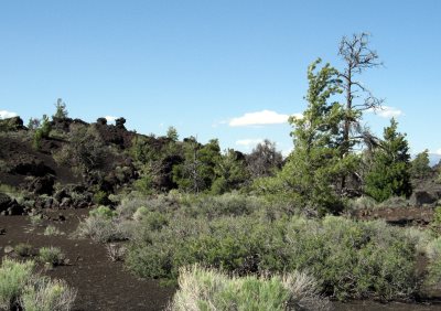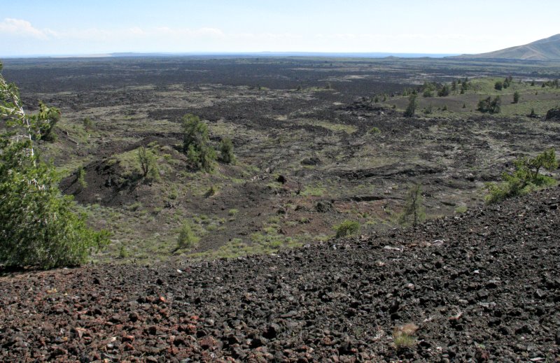 I was on the North Crater Trail, which led all the way back to our first hike on the North Crater Flow Trail. It's too bad I didn't have the time (or water) to hike any further because this was one of the best moments of my whole vacation. Blackish rock extended to the horizon, broken by the occasional green-leafed tree.