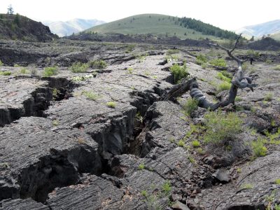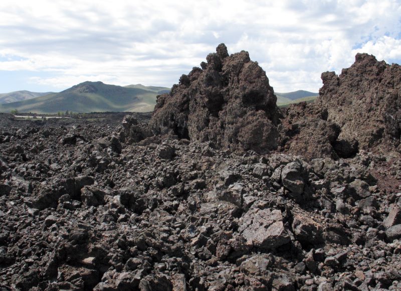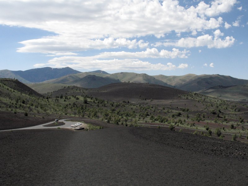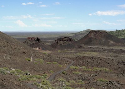 When we got in the vicinity of Crater of the Moon, it was very windy. And hot, especially in the black lava fields. We stopped at the visitor center for information and souvenirs. We only had a couple of hours at most, so I had to choose our itinerary carefully. I felt cheated out of a good hike at Crater Lake because the trails were closed, and our entire vacation hadn't offered nearly as many hiking opportunities as I had hoped. After expressing dismay about my time limit, the park rangers gave me some good suggestions.