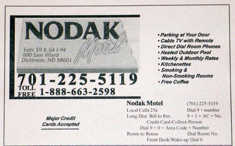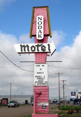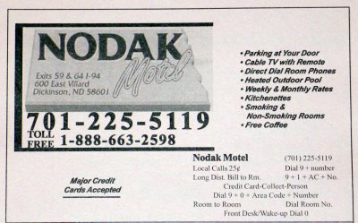 Our resting place for the night was the Nodak Motel in Dickinson. It was clean, comfortable, and affordable. The owners' English springer spaniels had puppies eight weeks ago, and my wife bugged me incessantly about buying one. Needless to say, bringing a puppy along on a three-week road trip would be a recipe for disaster. After we checked in, we tried to get dinner at a local place, the Dairy Barn, but service was too slow. After standing for five minutes in a line that didn't move, we opted for the Country Kitchen by I-94. There I ordered my second breakfast of the day at 9 PM Mountain Time.
