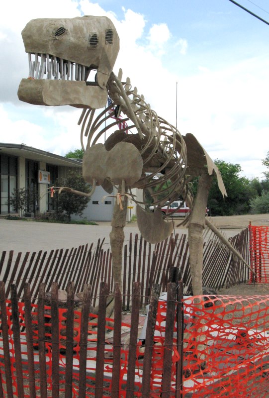 Glendive is home to Makoshika Dinosaur Museum, part of the Montana Dinosaur Trail (represented poorly on this map). But Glendive soon also will be home to Glendive Dinosaur & Fossil Museum. The latter intends to explain the dinosaurs from a creationist point of view (it's a trend), claiming that most popular natural history museums neglect " the scientific facts... that insist upon creation and absolutely demolish evolutionism’s nonsense." I don't know which museum this particular dinosaur represents, but since it's new I suspect it may be in conjunction with the creationist museum.