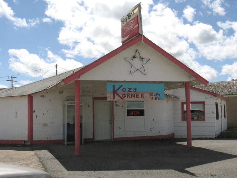 We stopped for lunch in Winnett, a tiny ranching town of 176 people. Surprisingly for its size, Winnett had several bars and two grocery stores. Obviously the town draws a much greater number of people than its population suggests. There is not another town within 35 miles as the crow flies (often much further by car since roads are sparse). By the way, Montana is so large yet sparse that the state highway map shows which towns have gas stations, hospitals, and even ambulance service. Our lunch consisted of burgers and fries at the Kozy Korner Cafe & Bar. Although I didn't care for the stale, smoky bar atmosphere (before I could check whether the cafe area was open, my wife had already sat down at the bar), the food was excellent.