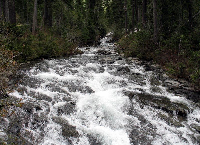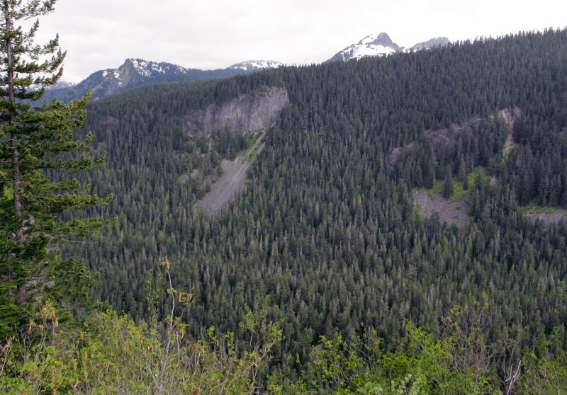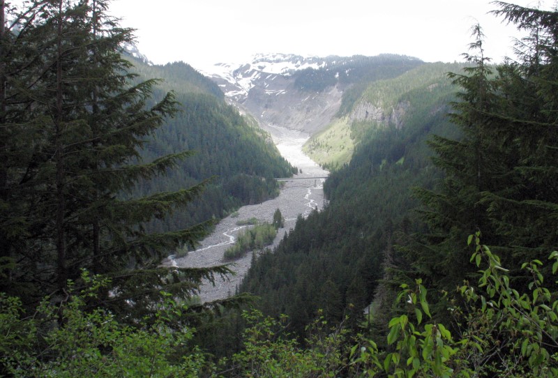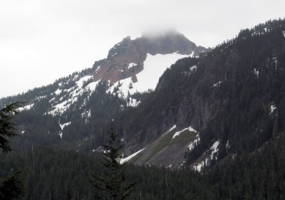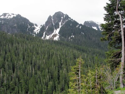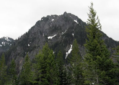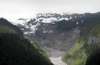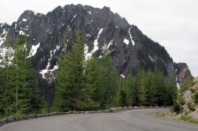 Skate Creek Road was another pretty, tortuous route, and I let my wife drive while I enjoyed the scenery for a change. At the west side gate, we paid our entry fee and got the park newspaper. The newspaper described changes in the park due to the floods. Most obvious was the rerouting of Kautz Creek. First we drove over a bridge with just a trickle of water beneath it, then a couple hundred yards later we crossed an obviously newer bridge with a powerful waterway below (it may only be a " creek," but keep in mind that it was snowmelt season). The road headed mostly upward from there, and the environment became increasingly gloomy. Needless to say, there would be no photos of Mount Rainier rising majestically above the other Cascades. I had to do some processing to make my pictures look decent. We skipped Christine Falls but paused on a one-way scenic drive to take some pictures. Since my wife isn't fond of mountain driving, I took over.