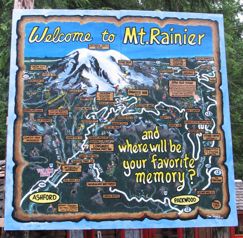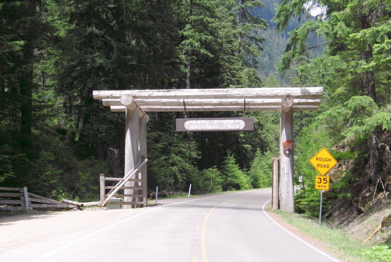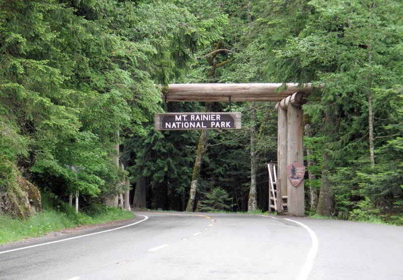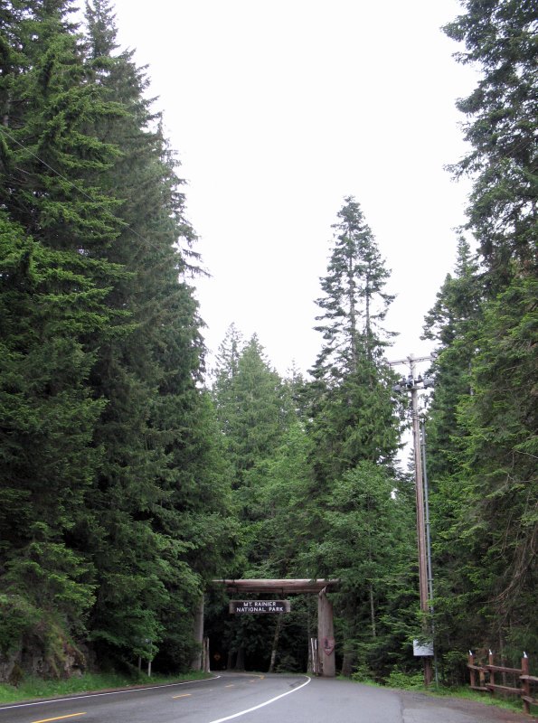 The bookstore inside didn't offer much, but the gift shop did not disappoint. At this point on our trip I was beginning to gently rib my wife about her affinity for gift shops. She seemed more interested in the shops than the scenery. My wife was hungry, so we went to the cafeteria. Big mistake. She didn't like her burger, and my hot chocolate was more like hot water with a subtle hint of cocoa. Then we drove back the way we came, leaving the park. The Nisqually Entrance at the southwest corner looked a lot like the southeast entrance.