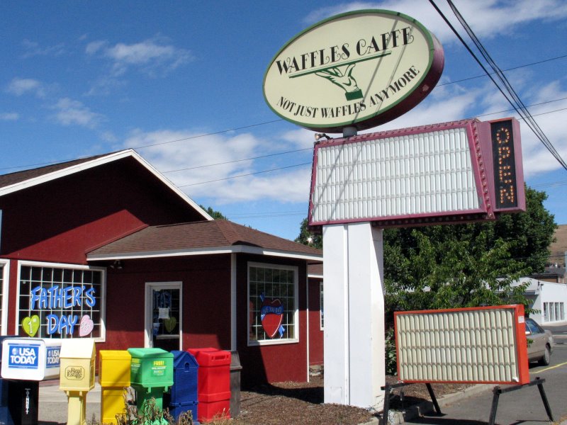 Once again we had waffles, this time at Waffles Caffe in Yakima. I sheepishly ordered the Iron Woman Omelet, which contained bacon, cheese, and hash browns (yes, the hash browns were inside the omelet -- Waffles N' More in Lewiston had a similar item). I felt better when the waitress reassured me that plenty of men order that dish, too. I had a plain " world's best" Belgian waffle on the side, but my wife ordered the banana split waffle with blueberries, strawberries, apples, bananas, ice cream, and whipped cream. Wisely, she opted for the "half" order. She barely finished the huge pile of fruit toppings, much less the waffle underneath.