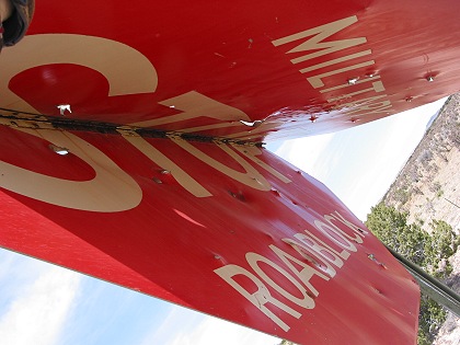 ... yes,  it was a sign to close the road for the military. US 380 skirted the northern boundary of White Sands Missile Range, most famous for the Trinity Site, the spot where the world's first atomic bomb was exploded. The Trinity Site itself was about 20 miles south of the highway. |