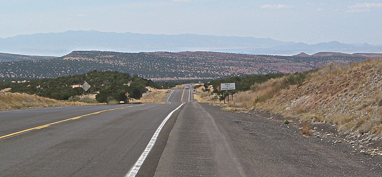 After climbing the Sierra Oscuras, I looked back down US 380, which can be seen snaking off into the distance. Snow-capped Sierra Blanca is visible on the right. US 380 had wide shoulders with narrow bike-friendly rumble strips. |
