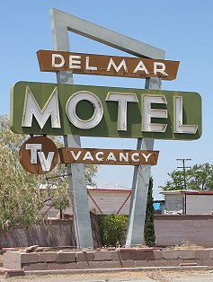 The Desert Lake Motel was converted into apartments. Again, there is my pet peeve: a saguaro in the wrong desert! This was a filming location for the movie Erin Brockovich a couple of years before I rode past. |