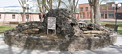 The sign warned people to stay off the " historic rock monument," but I couldn't find a sign that told anything about the monument. It reminded me of the " historic site" in Unionville, AL, that  I had seen a month earlier with a " do not loiter" sign but no explanation. Anyway, I could tell that the monument was made of lava rock from the nearby Valley of Fires, but that was all. |