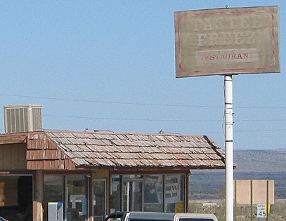 Despite the sun-faded, barely legible sign, the Tastee Freez at the north end of town was indeed open for business. |