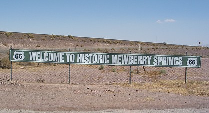 Newberry Mountain looms over this friendly Route 66 sign wishing the traveler a happy 2002. |